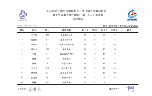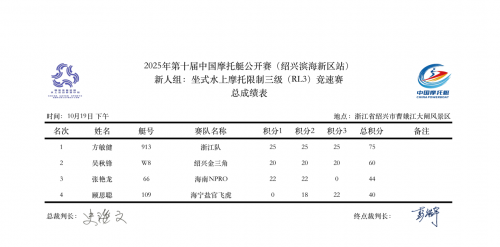乐清水上协会方子辰获得男子坐式水上摩托限制三级(RL3)竞速赛冠军,江苏奇峰体育陈樟柯、常州奇峰俱乐部罗嗣杰分别获得亚军和季军;