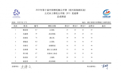 10月19日下午,随着男子立式水上摩托公开级(JO)竞速赛最后一轮比赛的顺利完成,2025年第十届中国摩托艇……