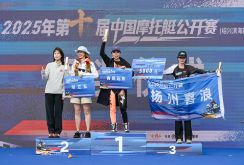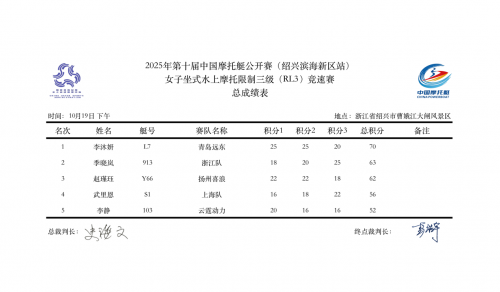 青岛远东李沐妍获得女子坐式水上摩托限制三级(RL3)竞速赛冠军,浙江队季晓岚、扬州喜浪赵瑾钰分别获得亚军和季军;