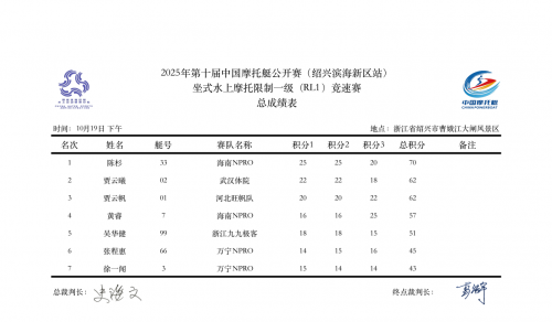 海南NPRO陈杉获得坐式水上摩托限制一级(RL1)竞速赛冠军,武汉体院贾云曦、河北旺帆队贾云帆分别获得亚军和季军;